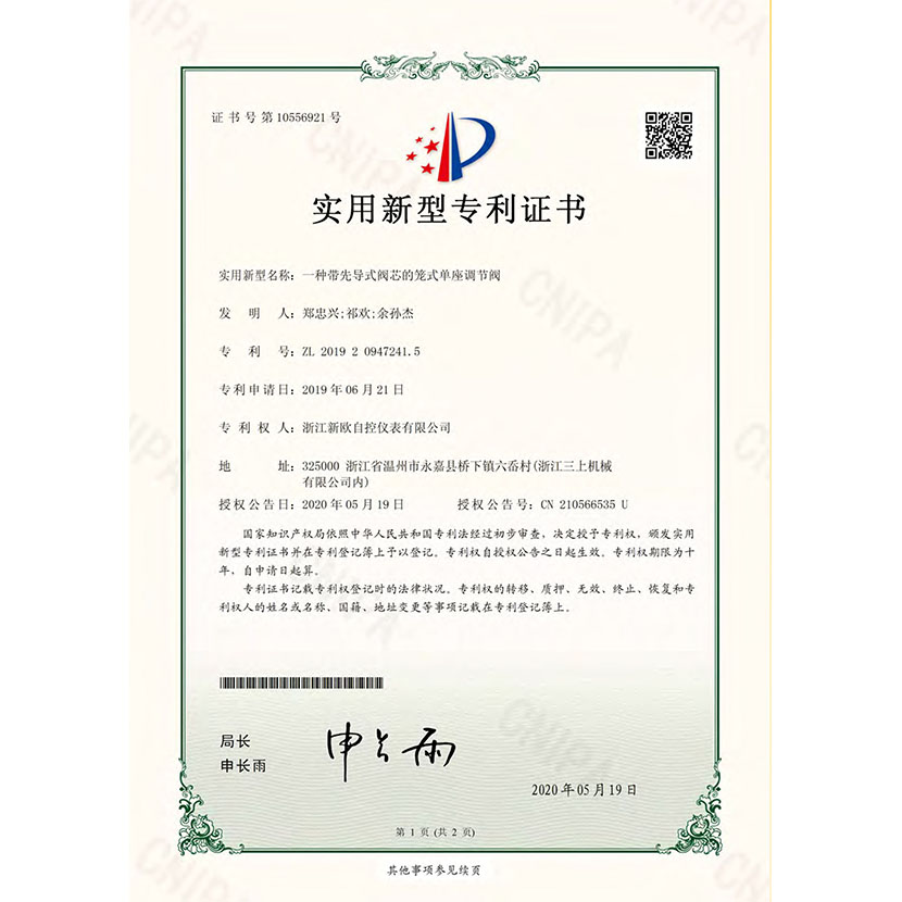 一種帶先導式閥芯的籠式單座調節(jié)閥 專利證書